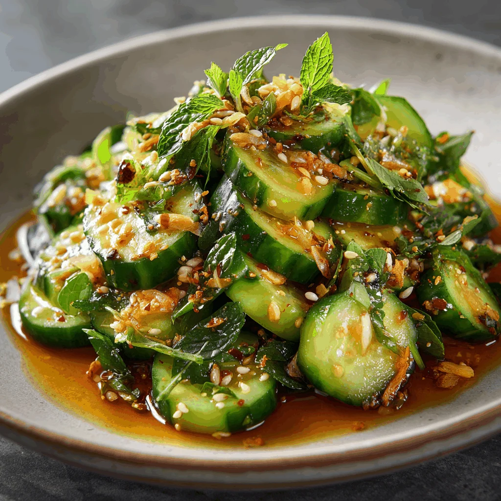 Alright, let’s get cooking! First, wash those cucumbers thoroughly and slice them into thin rounds. Think of this as a zen moment—let the rhythm of slicing soothe you. Next, whisk together the rice vinegar, soy sauce, sugar, and sesame oil in a small bowl. It’s like creating a little potion of deliciousness. Add in the green onions and chili flakes if you’re using them, and stir gently. Pour this dressing over your cucumbers in a large bowl and toss until they’re completely coated. Let them chill in the fridge for at least 30 minutes—this is where the magic happens, as the flavors meld beautifully. Just before serving, sprinkle with toasted sesame seeds for that extra crunch. Voila! You’ve just created a masterpiece.
