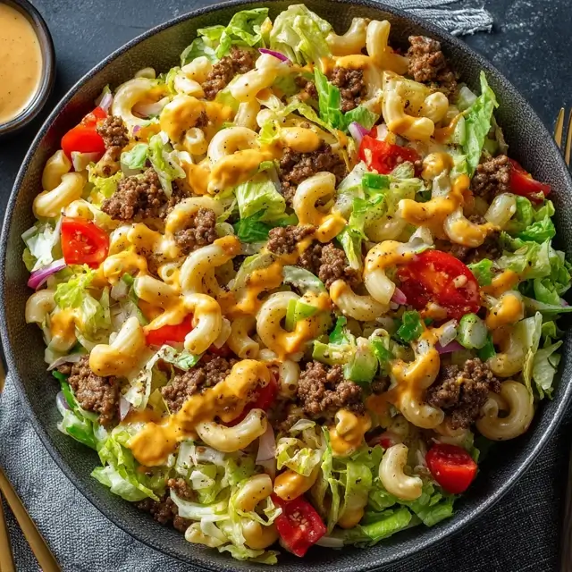 A delicious and healthy twist on the classic Big Mac, this salad combines savory beef, fresh vegetables, and a creamy homemade sauce.