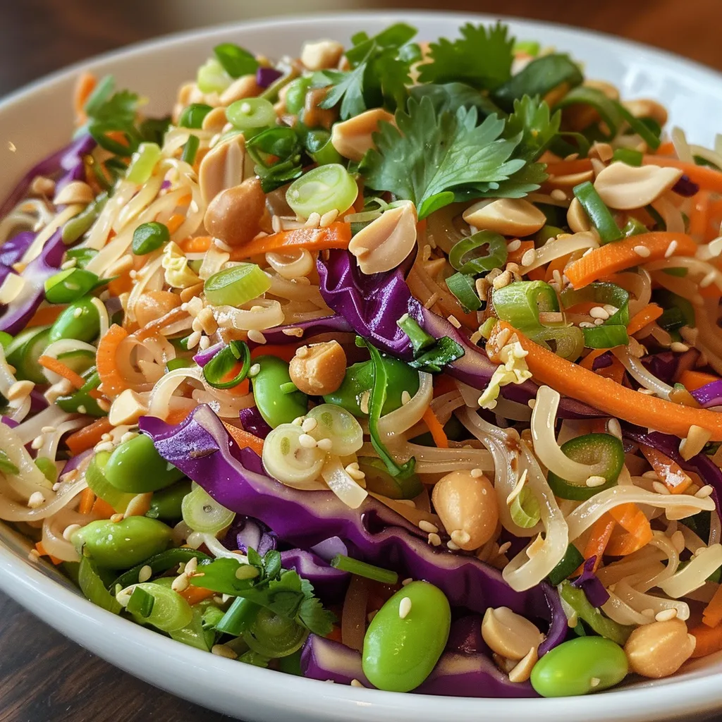 3. **Combine the salad:** In a large bowl, toss the cooled noodles with the purple cabbage, carrots, edamame, scallions, cilantro, and peanuts.