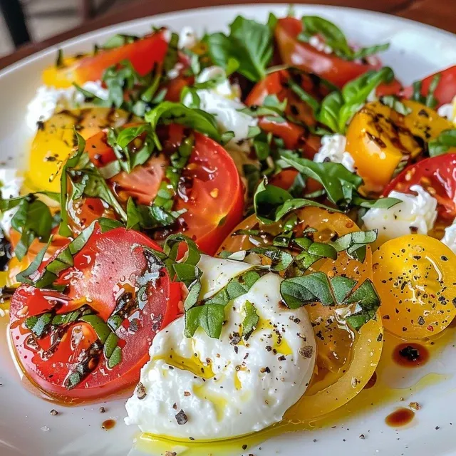 A fresh and vibrant salad featuring heirloom tomatoes, creamy burrata, and a balsamic glaze, perfect for summer gatherings.