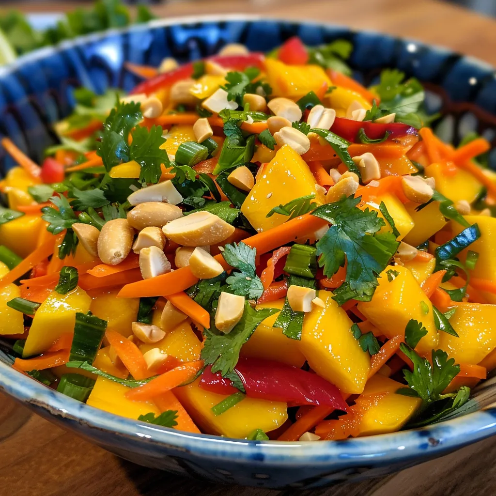A fresh and tangy Thai Mango Salad combines ripe mangoes with crunchy vegetables and a flavorful dressing for a delightful appetizer or light meal.