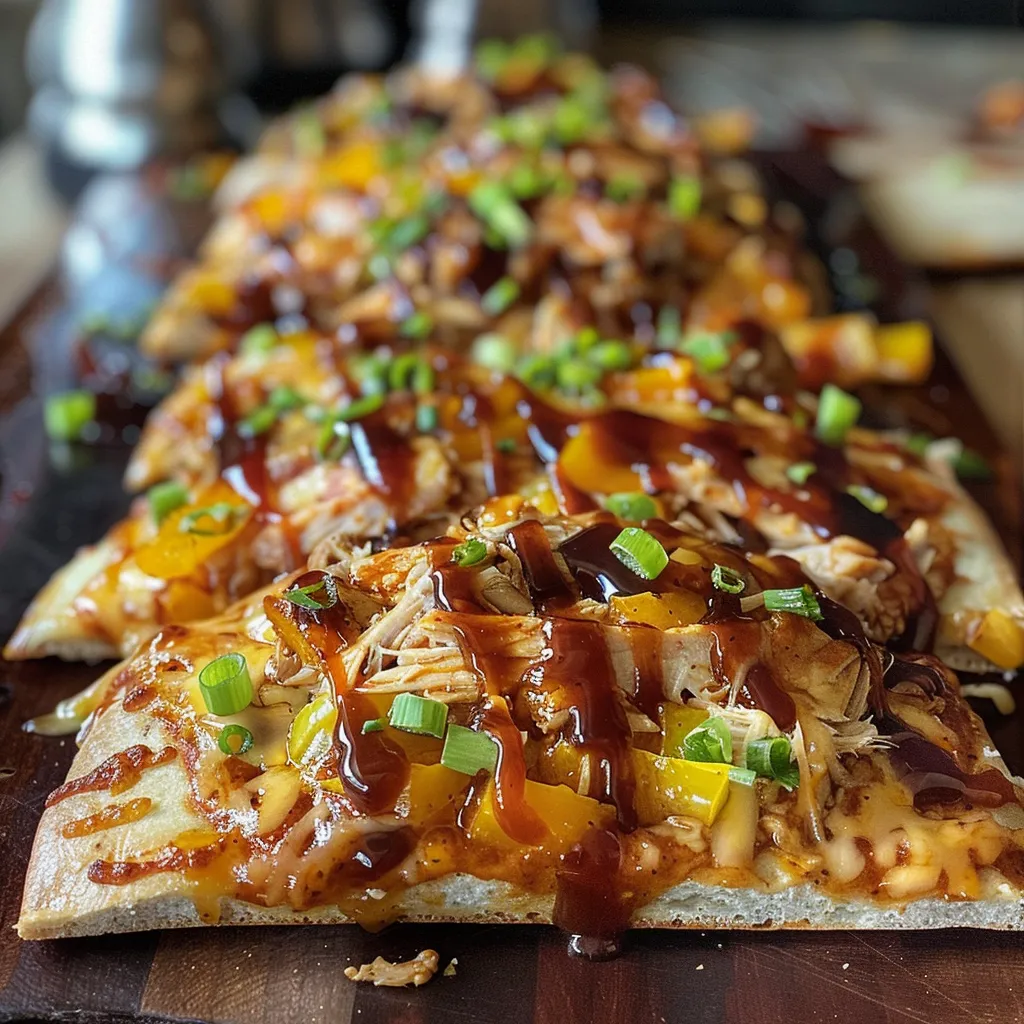 Juicy BBQ Chicken Flatbread with melted cheese and green onion garnish.