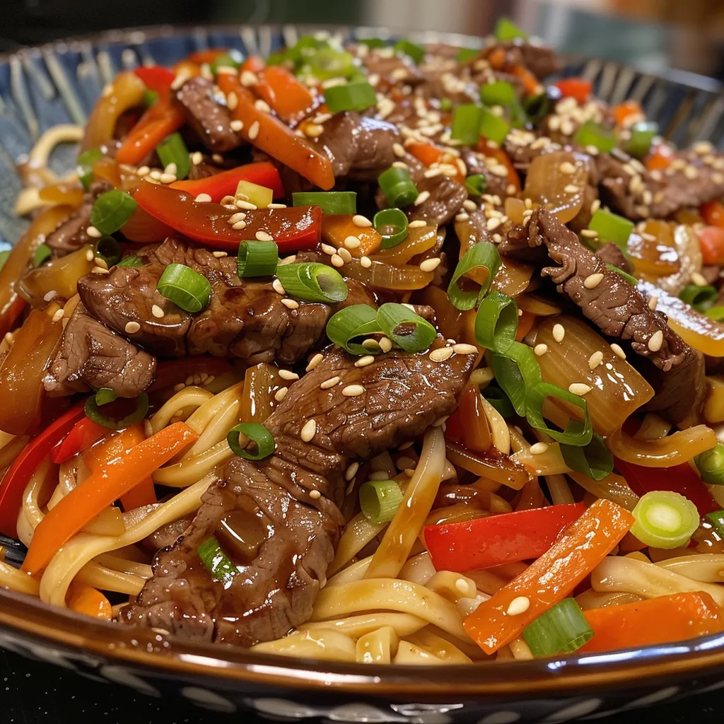 - Combine noodles with the beef and sauce, toss to coat. Garnish with sesame seeds and green onions before serving.